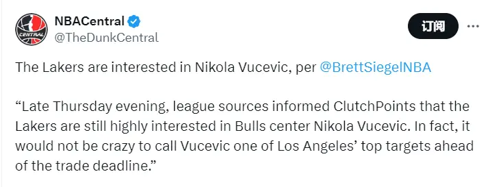 Siegel表示,湖人仍然对公牛队中锋武切维奇非常感兴趣。事实上,在交易截止日期前,将武切维奇视为湖人的头号目标之一并不疯狂。武切维奇吸引了包括湖人、勇士在内的多支球队兴趣,公牛想用武切维奇换回首轮签,但这些球队基本只愿意出多个次轮签。赛季至今,武切维奇场均20.1分10.3篮板3.4助攻0.9抢断0.6盖帽,投篮命中率55.3%,三分命中率41.2%。